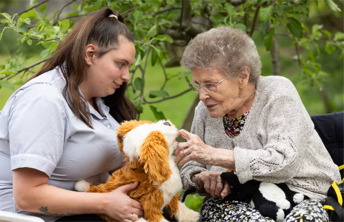 We use sensory toys, robotic pets, dolls, ribbons and personalised care tools to help residents feel calm and connected. These gentle aids can offer reassurance and spark meaningful moments throughout the day.